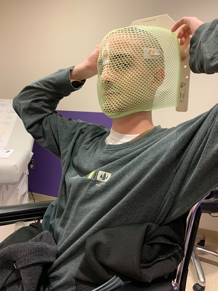 Also, check out picture attached. This is the mesh face mask that will be used to make Zane's mold for his radiation treatment. This, along with careful "planning," where they lay him in place and simulate the radiation, placing him in the perfect positions and measuring to the millimeter will keep the radiation focused on the specific areas needed and away from where it isn't needed.