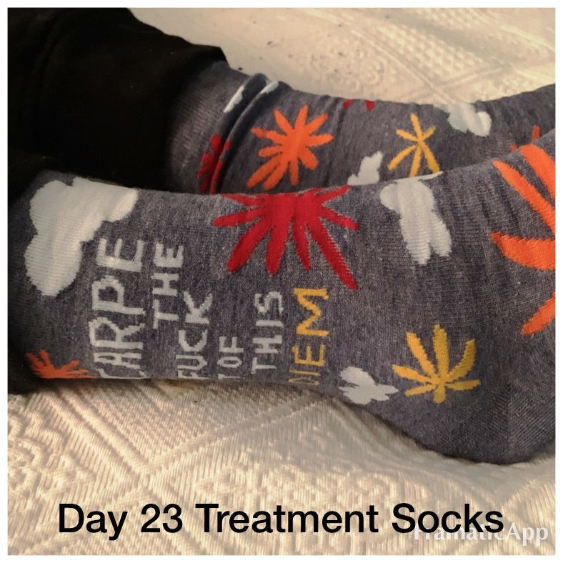 Here were the fashion socks for Treatments 21 through 25 (adult language alert): Day 21: Nightmare Before Christmas socks Day 22: Take No Shit, Give No Fucks socks Day 23: Carpe the Fuck out of this Diem socks Day 24: Jack Skeleton socks Day 25: POW! socks